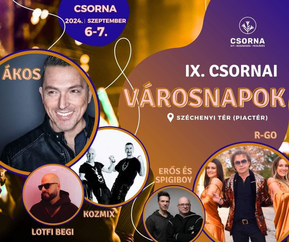 A IX. Csornai Városnapokon neves előadók sora lép színpadra szeptember 6-án, pénteken és 7-én szombaton. Ákos örök dalaira táncolhat a közönség a város piacterén, vagyis a Széchényi téren, de ott lesz Szikora Róbert a Gidákkal és a Kozmix is. Fellép Lotfi Begi, illetve Erős és Spigiboy.
