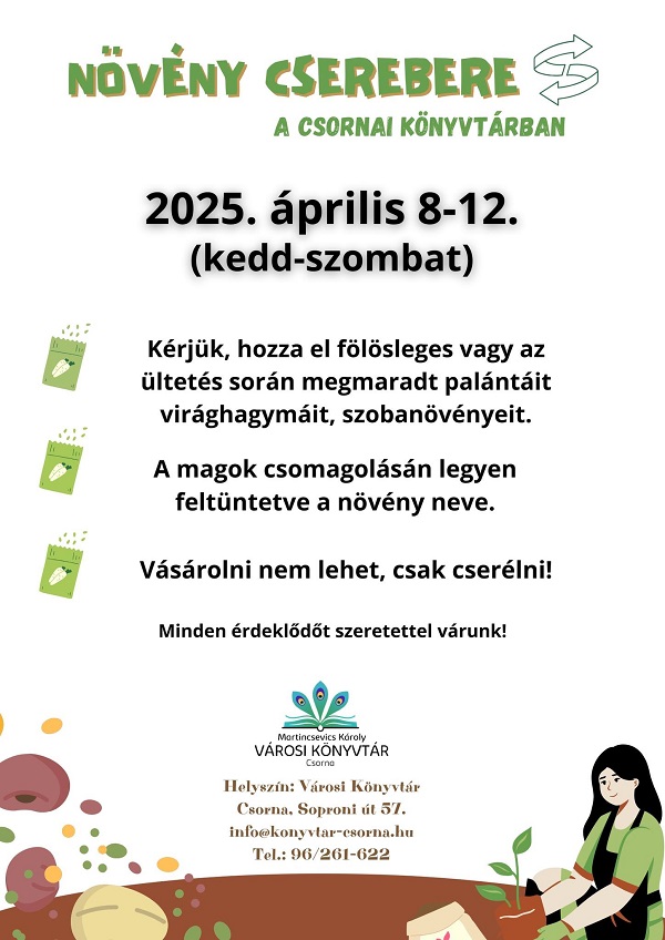Április 8–12. között (keddtől szombatig) várják azokat, akik szívesen cserélnék el fölöslegessé vált vagy ültetés után megmaradt palántáikat, virághagymáikat, esetleg szobanövényeiket más kertbarátokkal.