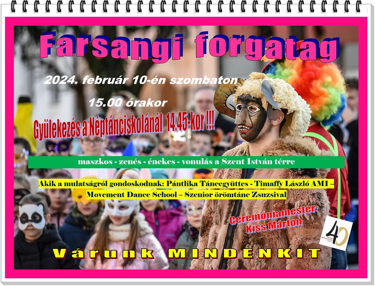A Néptánciskolától délután 3 órakor maskarában, álarcban, jelmezben indul a város apraja-nagyja és zeng az ének egészen a Szent István térig. A jó hangulatról Kiss Márton ceremóniamester, az óriási mulatságról a Pántlika Néptáncegyüttes, a Timaffy László AMI, Movement Dance School gondoskodik, valamint várható Szenior örömtánc Zsuzsival.