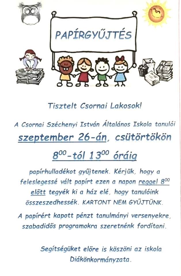 A Széchenyi Iskola diákjai szeptember 26-án, csütörtökön, papírgyűjtést szerveznek reggel 8 órától délután 1 óráig.