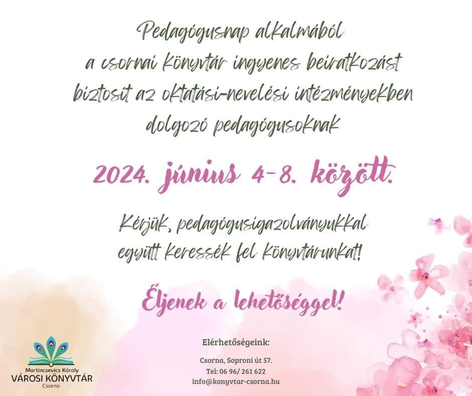 Pedagógusnap alkalmából június 4. és 8. között a Csornai Könyvtár lehetőséget biztosít a pedagógusoknak ingyenes beiratkozásra. A kezdeményezés keretében az oktatási-nevelési intézményekben dolgozó pedagógusok számára kínálják az ingyenes tagságot a könyvtárban. Az esemény során elegendő a pedagógus igazolvány felmutatása, és máris elkezdődhet a beiratkozás folyamata.