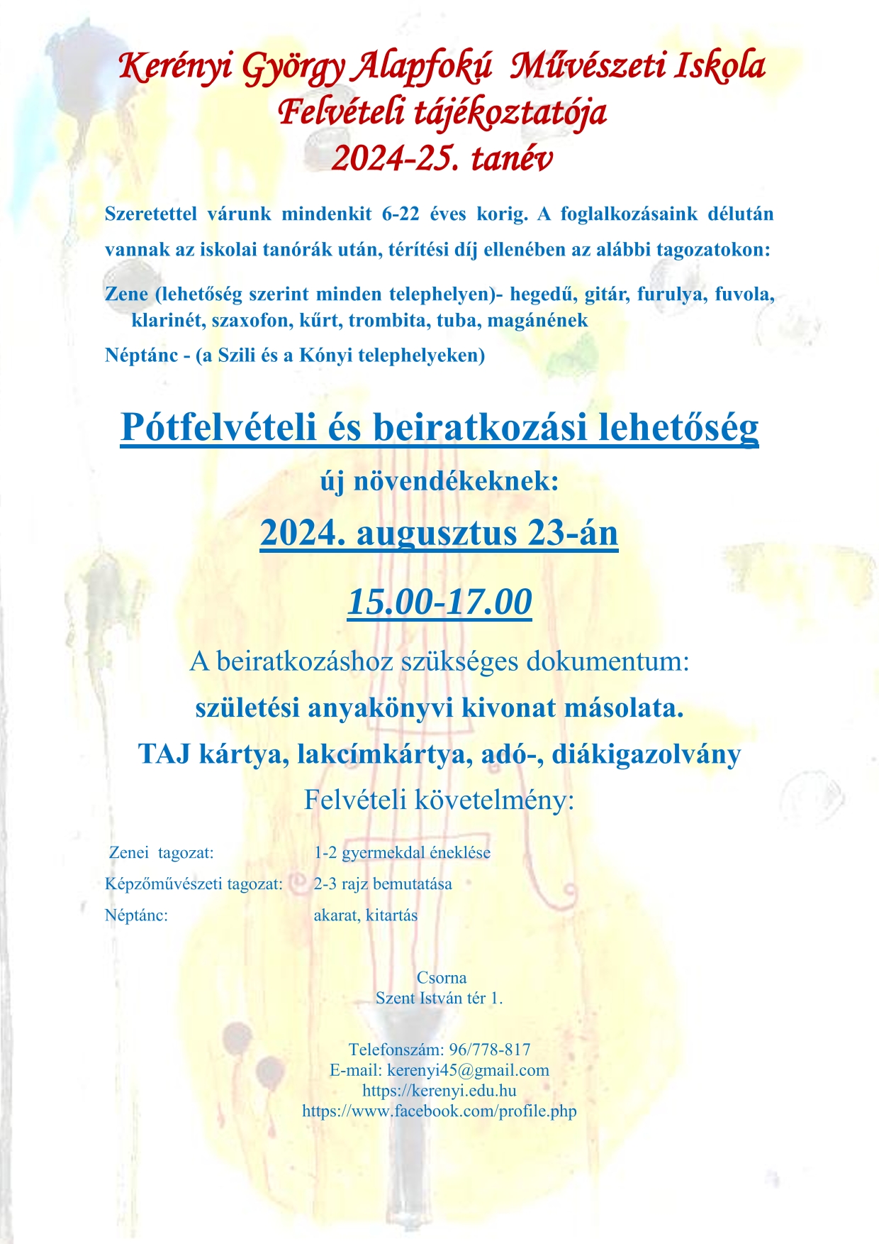A Kerényi György Alapfokú Művészeti Iskola pótbeiratkozást hirdet a 2024-25-ös tanévre, amelyre augusztus 23-án, 15:00 és 17:00 óra között kerül sor Csornán, a Szent István téren.
