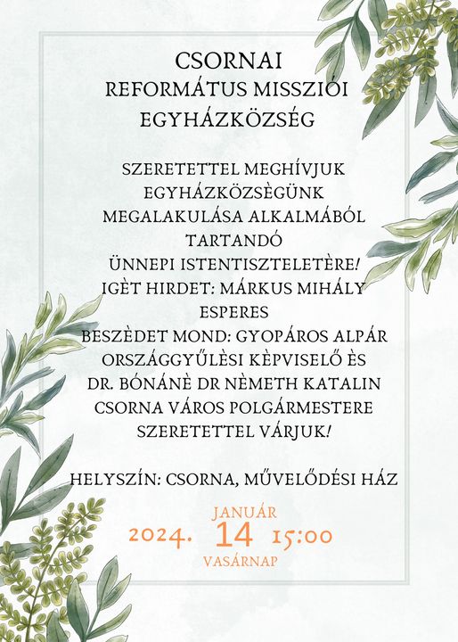 Református missziói egyházközség megalakulása alkalmából ünnepi istentiszteletet tartanak Csornán a Művelődési házban január 14-én, vasárnap délután 3 órakor.