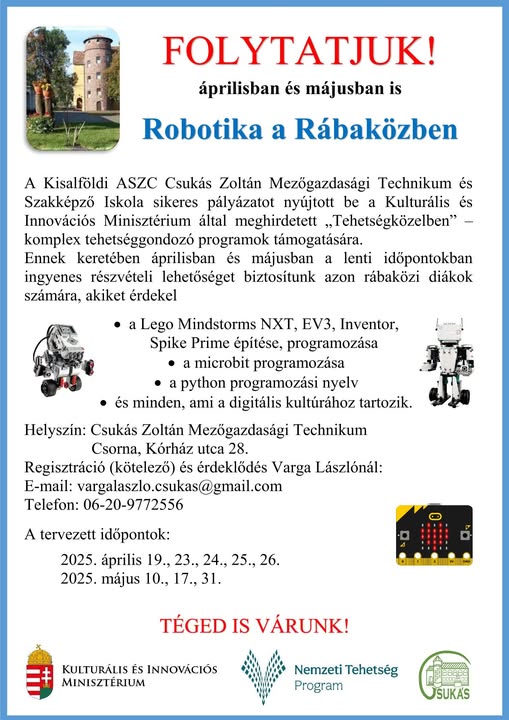 A Kisalföldi ASZC Csukás Zoltán Mezőgazdasági Technikum és Szakképző Iskola folytatja sikeres „Robotika a Rábaközben” programját áprilisban és májusban.