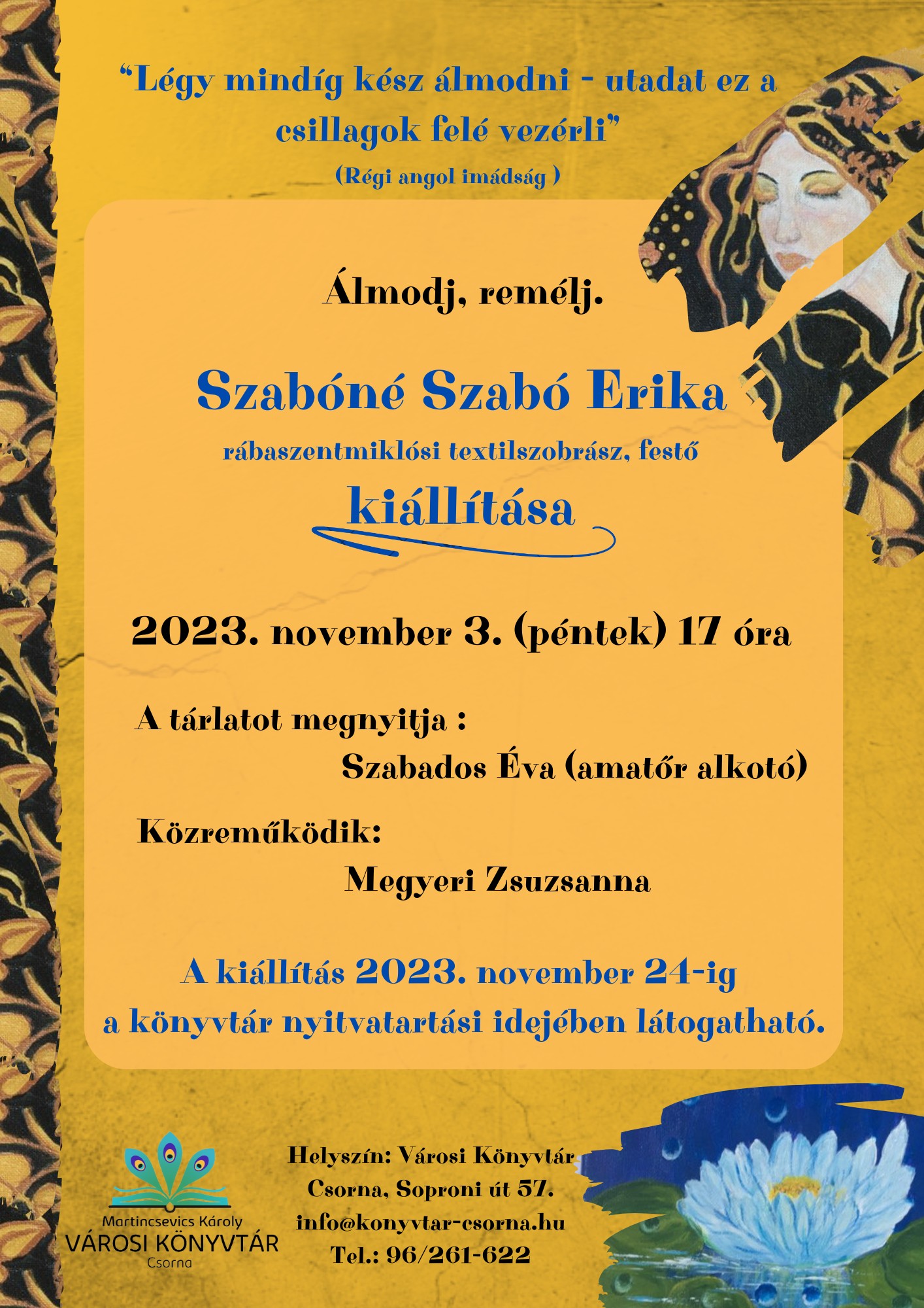 Egy izgalmas és kreatív művészeti kiállításra invitál minden érdeklődőt a Városi Könyvtár Csornán. Szabóné Szabó Erika, rábaszentmiklósi textilszobrász és festő kiállításának megnyitója november 3-án, 17 órakor kezdődik a könyvtárban.