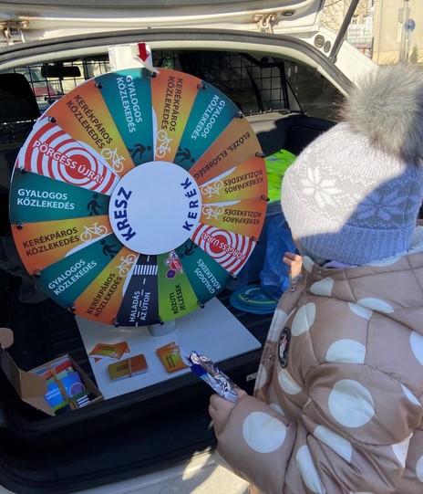 A kijelölt gyalogos átkelőhelyeknél közlekedő, vállalkozó szelleműeknek a szerencsekereket megpörgetve, a közlekedési szabályokkal kapcsolatban, különböző témakörökben kellett helyesen válaszolni. A jó választ adóknak az ajándék, jutalom sem maradt el.