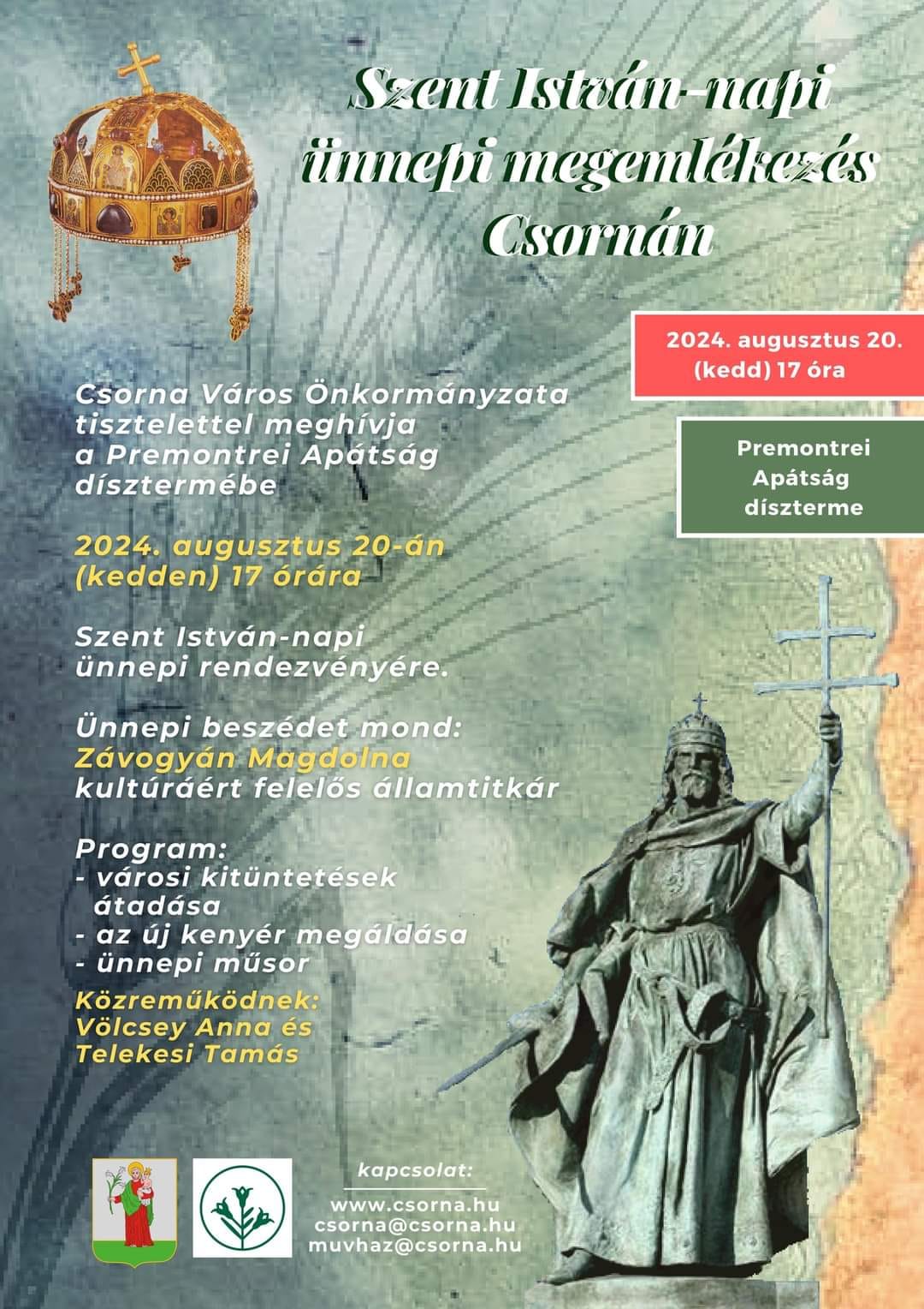 Csorna önkormányzata idén is ünnepséget rendez Szent István napján, augusztus 20-án, kedden.