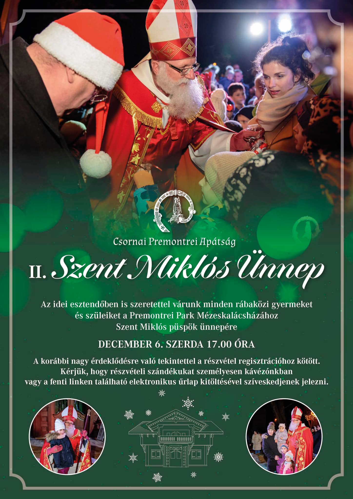 Csorna idén is ünnepi hangulatba öltözik, hiszen Szent Miklós püspök ismét látogatást tesz a városban. A premontreiek nagy szeretettel hívják a csornai és a rábaközi gyermekeket és szüleiket a Premontrei Park Mézeskalács házához.