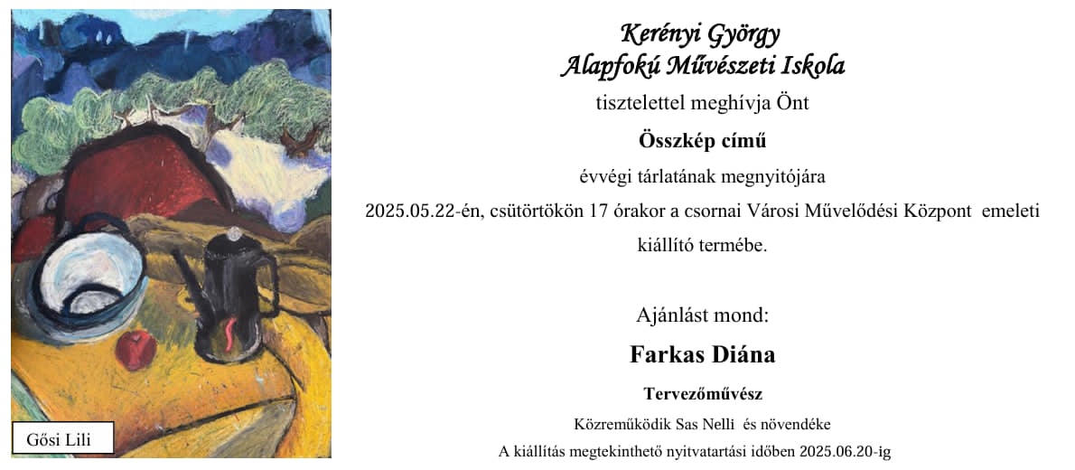 A Kerényi György Alapfokú Művészeti Iskola május 22-én, csütörtökön 17 órától nyitja meg év végi kiállítását „Összkép” címmel a csornai Városi Művelődési Központ emeleti kiállítótermében.