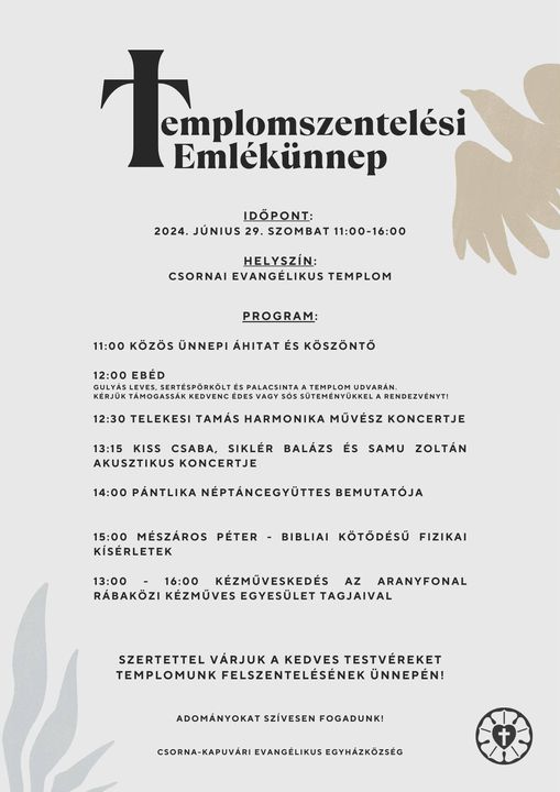 Június 29-én, szombaton, különleges eseményre invitál minden érdeklődőt a Csorna Evangélikus Egyház. A templomszentelési emlékünnep alkalmából délelőtt tizenegy órától délután négy óráig színes programokkal várják a résztvevőket. Az esemény nemcsak az egyházközség tagjainak szól, hanem mindenkit szeretettel látnak, aki egy tartalmas és szórakoztató napot szeretne eltölteni.