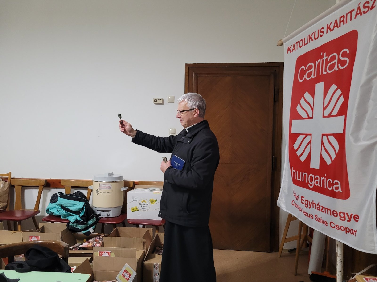 Az önkéntesek mellett közösségi szolgálatot teljesítő fiatalok is segítettek a leltározásban és a csomagolásban, melynek köszönhetően több, mint 500 kg élelmiszer (tartós élelmiszer, alma, burgonya, konzerv és friss cipó) juthatott el a családokhoz, miután Winkler Zsolt atya az adományokat megáldotta.