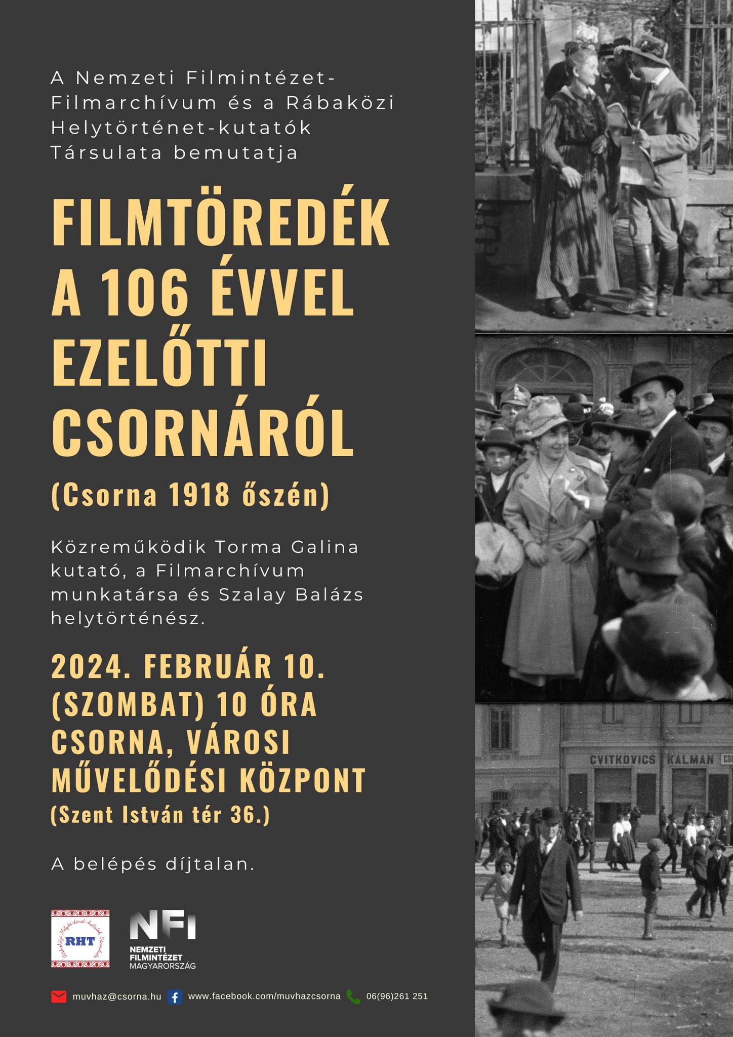 Lebilincselő időutazáson vehet rész az érdeklődő Torma Galina, kutató, a Nemzeti Filmarchívum munkatársa és Szalay Balázs, a Rábaközi Helytörténeti-kutatók Társulatának vezetője közreműködésével. Nekik köszönhetően visszarepülhet a néző a 106 évvel ezelőtti Csornára.