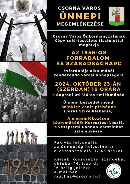 Csorna Város Önkormányzata tisztelettel vár mindenkit az 1956-os forradalom és szabadságharc évfordulójának alkalmából megrendezett városi ünnepségre, amelyre október 23-án, 18 órakor kerül sor a Soproni úti '56-os emlékműnél.