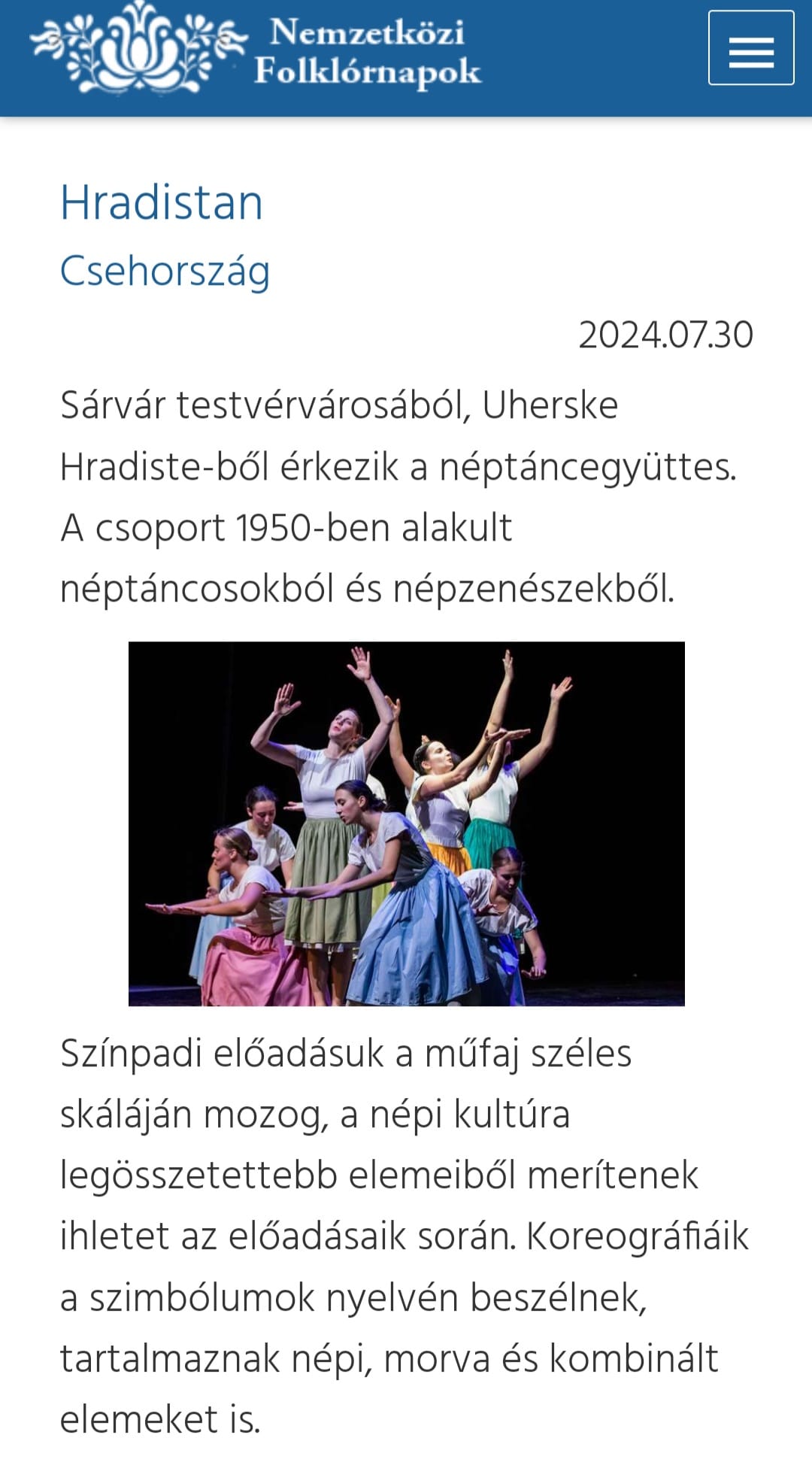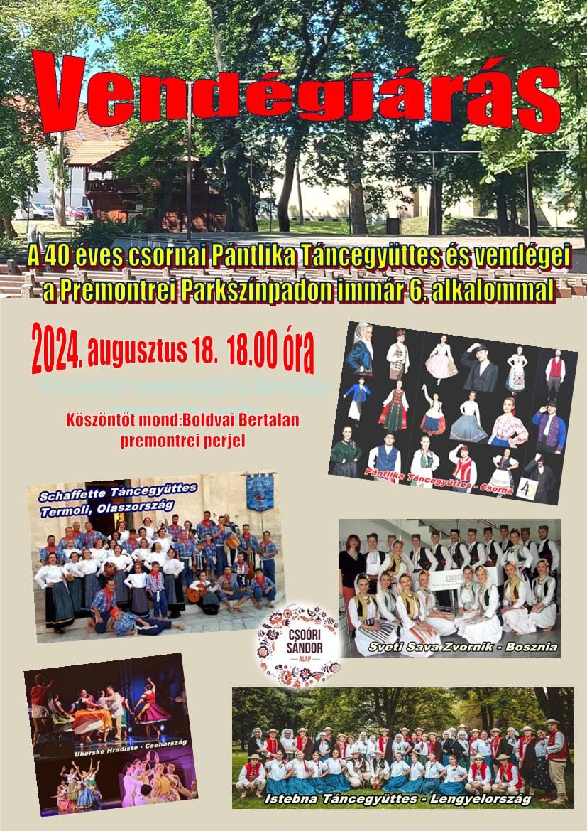 Az idén 40 éves csornai Pántlika Néptáncegyüttes 6. alkalommal szervezi meg a ,,Vendégjárás" elnevezésű programját augusztus 18-án, holnap délután 6 órakor a Premontrei Parkszínpadon.