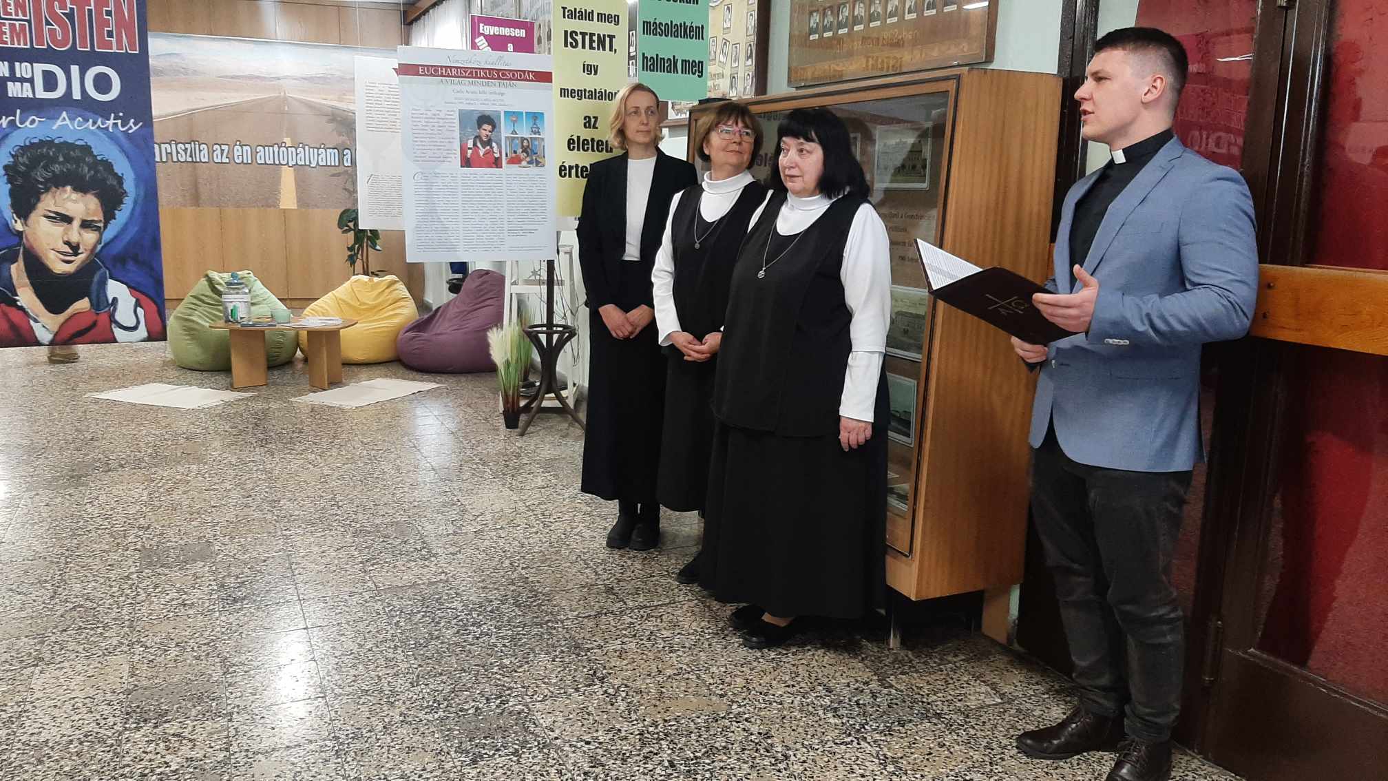 Carlo Acutis egy sportcipős, farmernadrágos olasz fiú volt, aki nagyon tehetséges volt az informatika világában, de fiatalon, súlyos betegségben, 15 évesen hunyt el. Szerette Krisztust és a szegényeket, mindennap áldozott, virtuális kiállítást rendezett az eucharisztikus csodákról. Élete történetével az iskola példát kívánt állítani tanulói számára. A kiállítást Méry László atya, az iskolalelkész nyitotta meg.