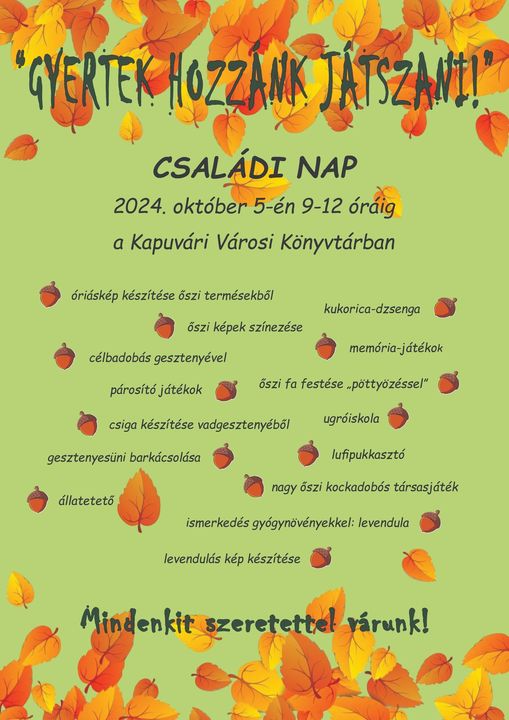 Október 5-én délelőtt 9 és 12 óra között a Kapuvári Városi Könyvtár várja a családokat egy szórakoztató programra.