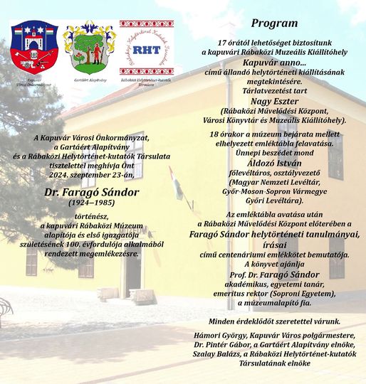 Szeptember 23-án, hétfő a Kapuvári Városi Önkormányzat, a Gartáért Alapítvány és a Rábaközi Helytörténet-kutatók Társulata szervezésében emlékeznek meg Dr. Faragó Sándor (1924–1985) történészről, a kapuvári Rábaközi Múzeum alapítójáról és első igazgatójáról születésének 100. évfordulója alkalmából.