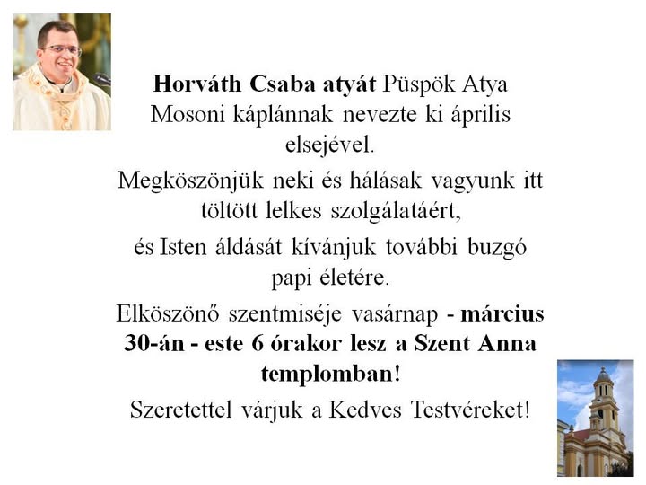 Horváth Csaba atyát a Püspök Atya Mosonba nevezte ki káplánnak április elsejével.
