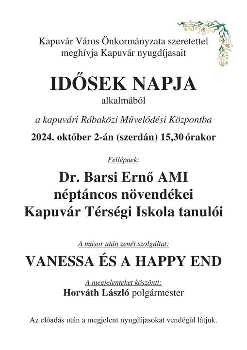 Az esemény 15:30-kor kezdődik, és célja a nyugdíjasok iránti tisztelet kifejezése. Az ünnepségen a Dr. Barsi Ernő AMI néptáncos növendékei és a Kapuvári Térségi Iskola tanulói lépnek fel, akik néptánc-előadásukkal idézik fel a rábaközi hagyományokat.