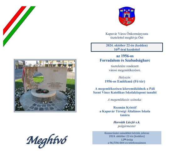 Október 22-én, kedden, 16:00 órától kezdődően a kapuvári városvezetés tisztelettel várja a helyi lakosokat és az érdeklődőket a városi megemlékezésre, amelyet az 1956-os Forradalom és Szabadságharc tiszteletére rendeznek.