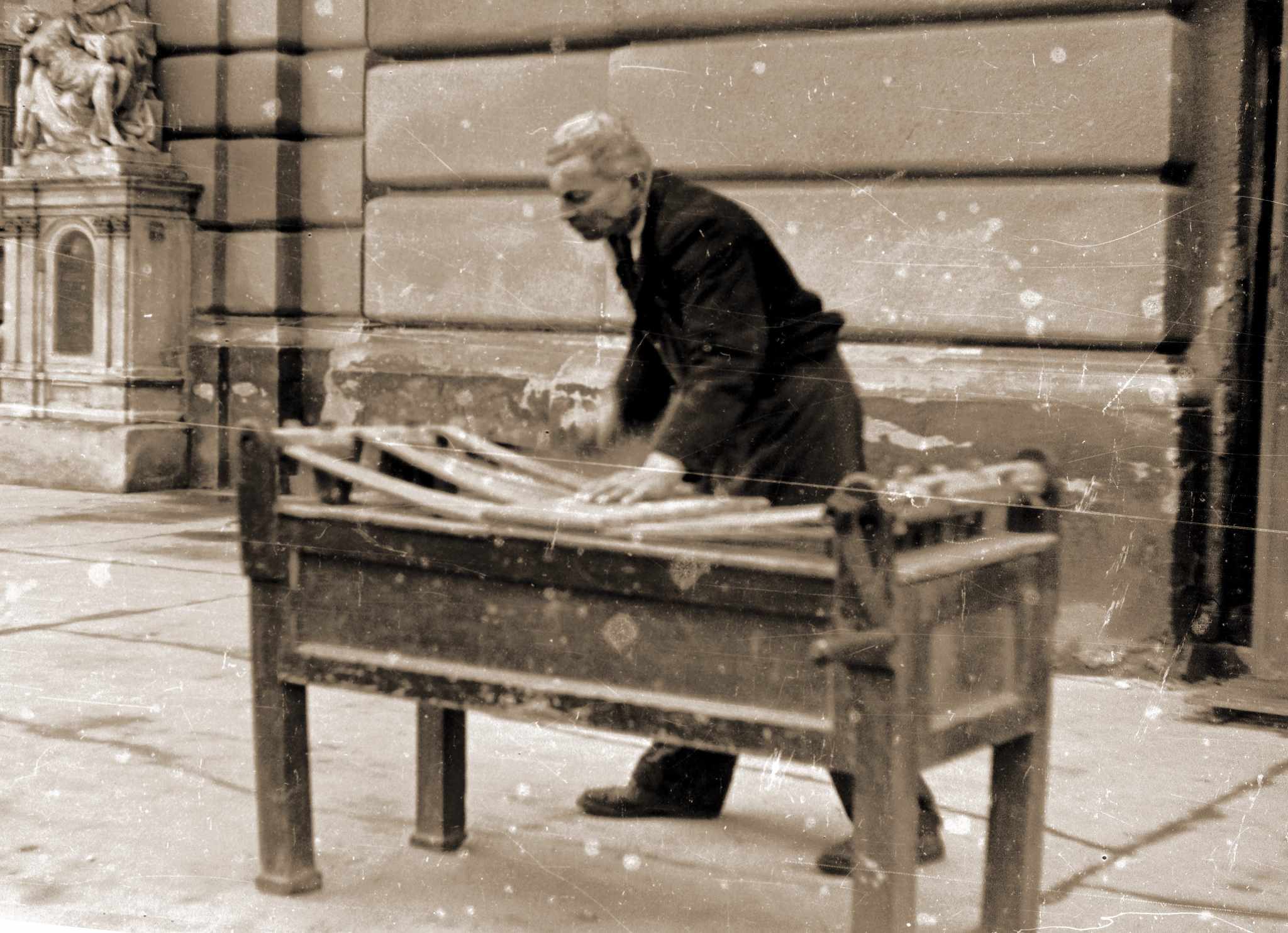 A harangozó, Nagy Mihály tekeri a ládakereplőt a kapuvári Fő téren álló Szent Anna templom előtt 1963-ban.