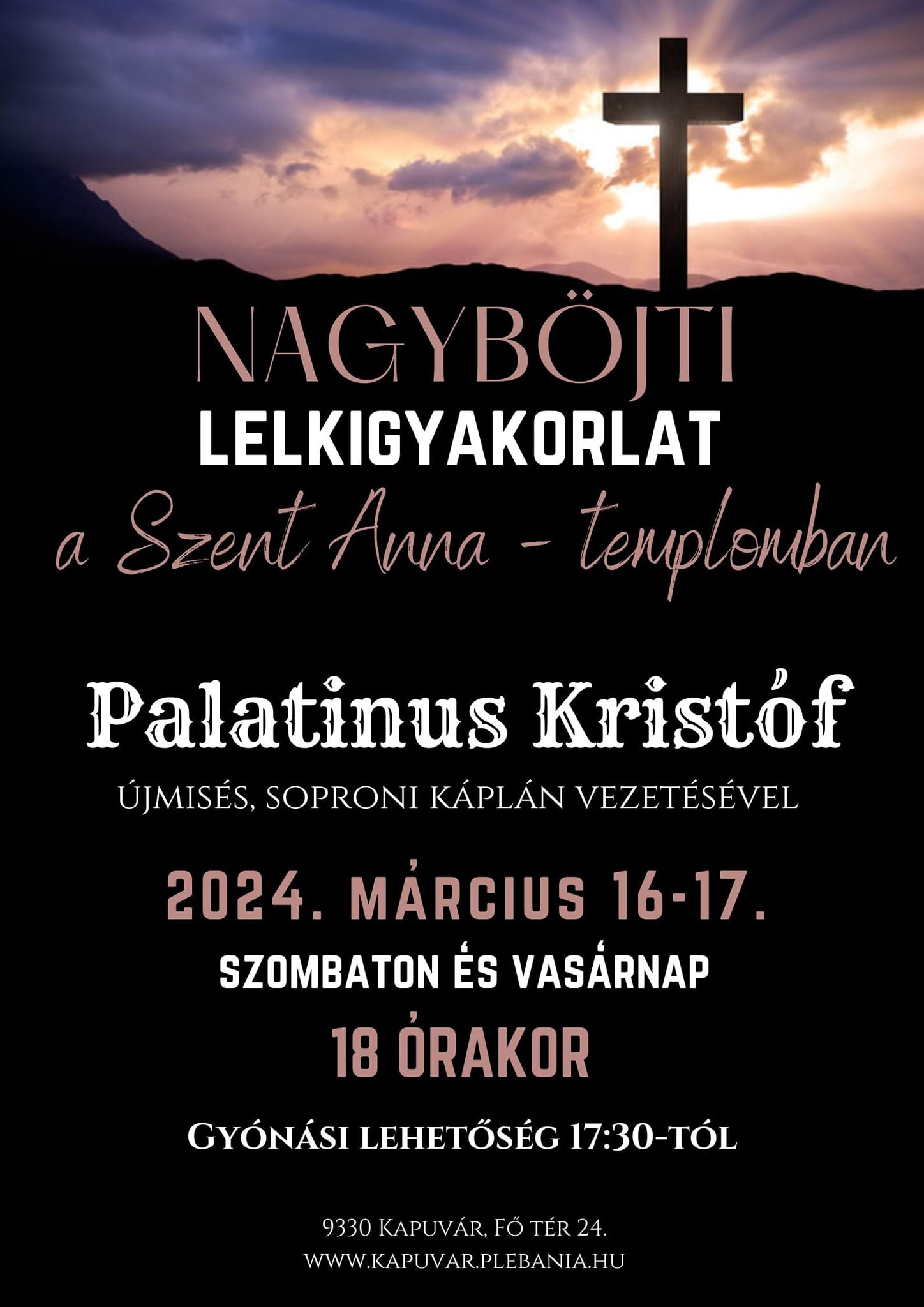 2024. március 16-án szombat és 17-én vasárnap 18 órától nagyböjti lelkigyakorlatot tartanak a kapuvári Szent Anna templomban.