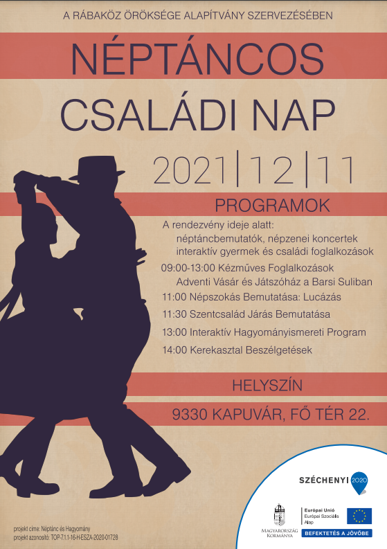 A Rábaköz Öröksége Alapítvány 2021. december 11-én rendezi meg a néptáncot és a hozzá köthető hagyományos népi kultúrkört a középpontjába helyező családi napot. A rendezvény helyszíne a Dr. Barsi Ernő Alapfokú Művészeti Iskola épülete (9330 Kapuvár, Fő tér 22.).