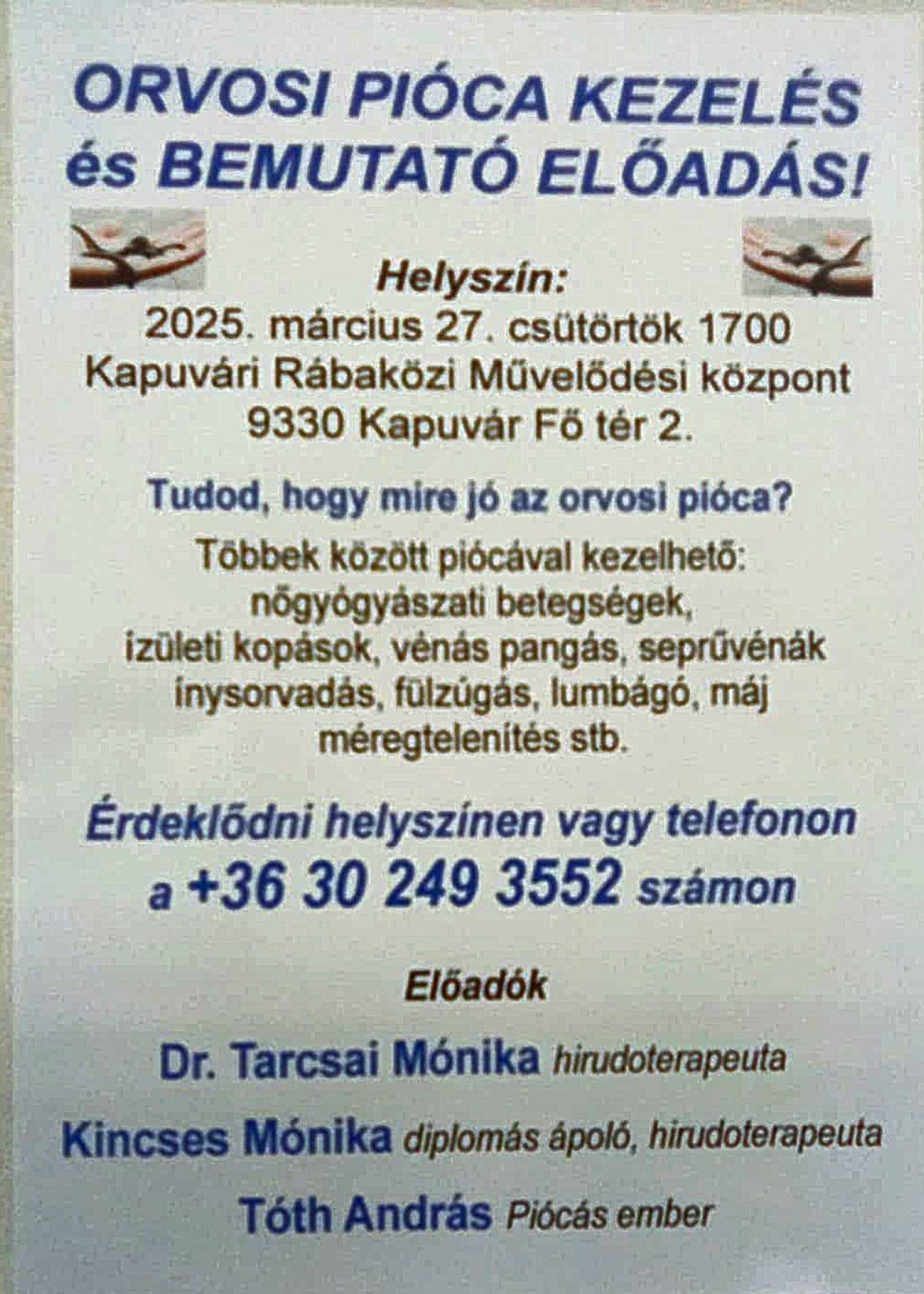 Az eseményre március 27-én, csütörtökön 17:00 órától kerül sor a Kapuvári Rábaközi Művelődési Központban. Az előadás célja, hogy bemutassa az orvosi piócák (Hirudo medicinalis) jótékony hatásait, valamint azok felhasználási lehetőségeit különböző betegségek esetén.