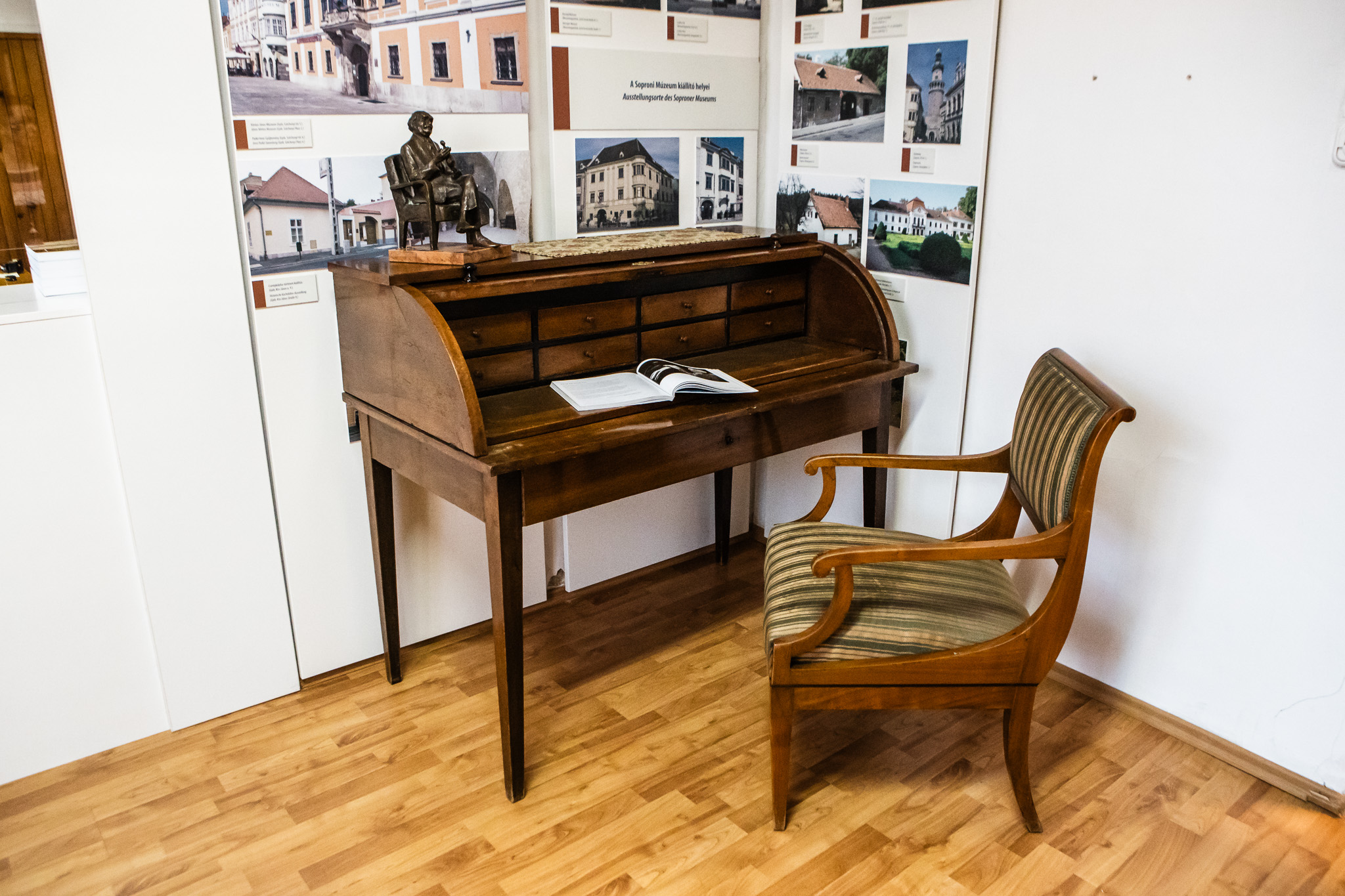 - A lefelé enyhén keskenyedő lábú íróasztal felső, furnérozott részének felhúzhat redőnye fiókokat rejt. A műtárgy 1860-as ’70-es évekből származik és nem sokkal későbbi a finom művű, hajlított támlájú és karfájú kárpitozott karosszék sem – beszélt a kiállított tárgyról Erdősné Varga Izabella, az intézmény tárlatvezetője, aki számos érdekességet tud a kiállított remekművekről, illetve az egykori Pátzay Pál szoborgyűjteményéből és plasztikáiból, kitüntetésiből, személyes, dokumentumaiból összeállított tárlatról is mesél az intézménybe látogatóknak.