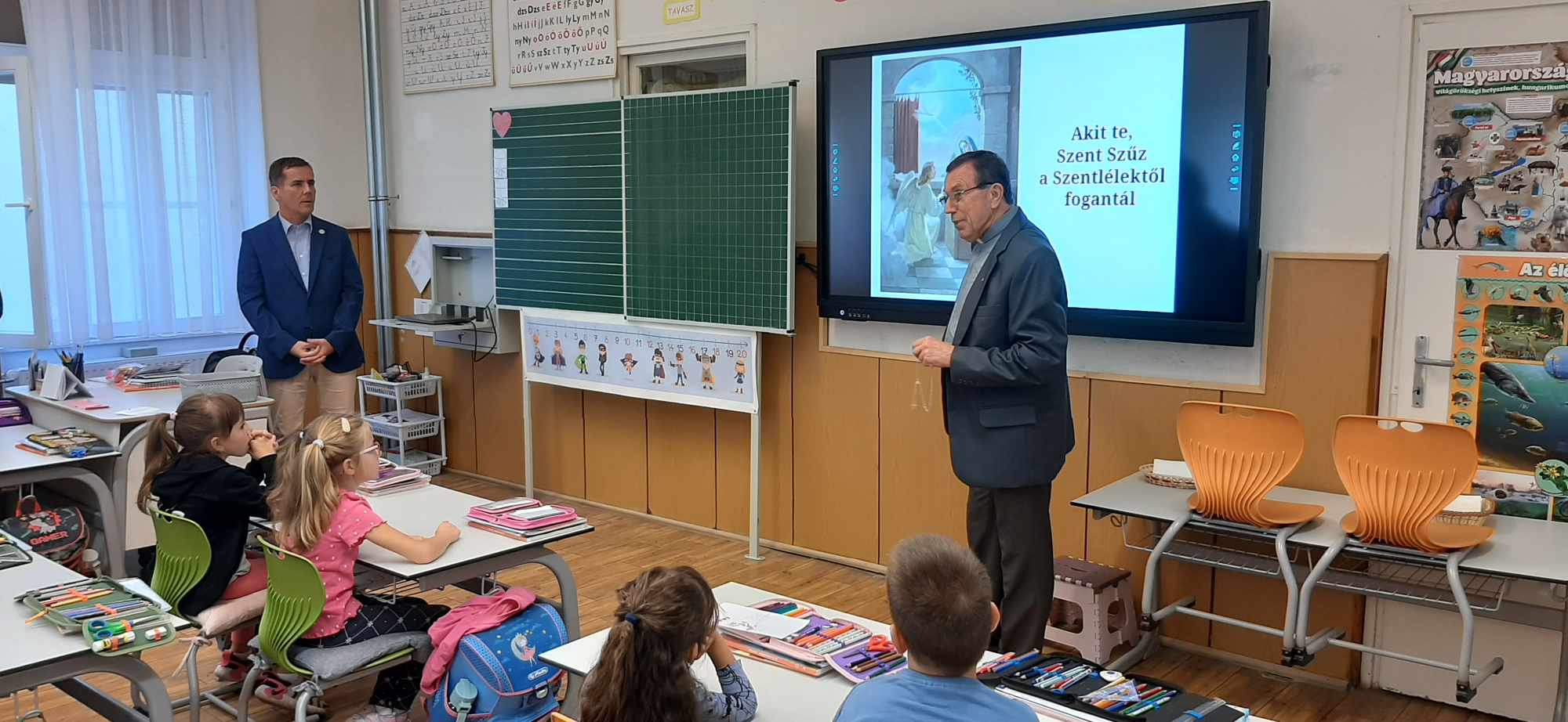 Radó Tamás atya, az iskola püspöki biztosa Biró Péter igazgató úrral átadta az intézmény elsősei részére a szentolvasót. Tamás atya vezetésével megismerkedtek a gyerekek e különös imádsággal, majd együtt imádkoztak.