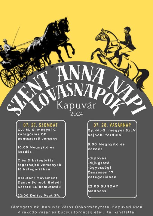 Kapuvár idén is izgalmas programokkal várja a lovassportok kedvelőit a Szent Anna-napi Lovasnapokon július 27-28-án kerülnek megrendezésre. A rendezvény helyszíne a város központja, ahol színes és változatos programokkal készülnek a szervezők, hogy minden korosztály számára felejthetetlen élményt nyújtsanak.