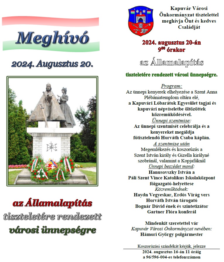 Kapuvár önkormányzata az államalapítás tiszteletére rendezett városi ünnepségre várja a lakosságot augusztus 20-án, holnap 9 órától.