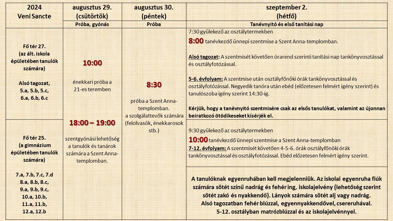 - 8:00: Ünnepi szentmise a Szent Anna-templomban az 1-6. évfolyam számára. Az alsó tagozat számára a szentmisét követően órarend szerinti tanítás lesz, tankönyvosztással és osztályfotózással.