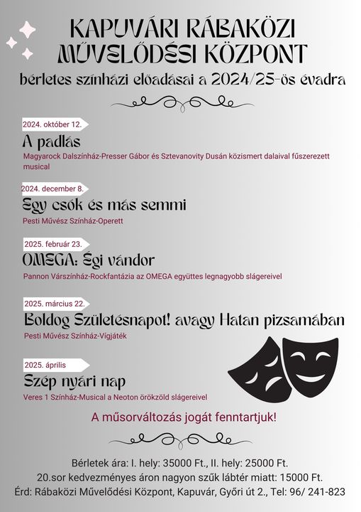 A Kapuvári Rábaközi Művelődési Központ a 2024/25-ös évadban is változatos színházi programokat kínál.