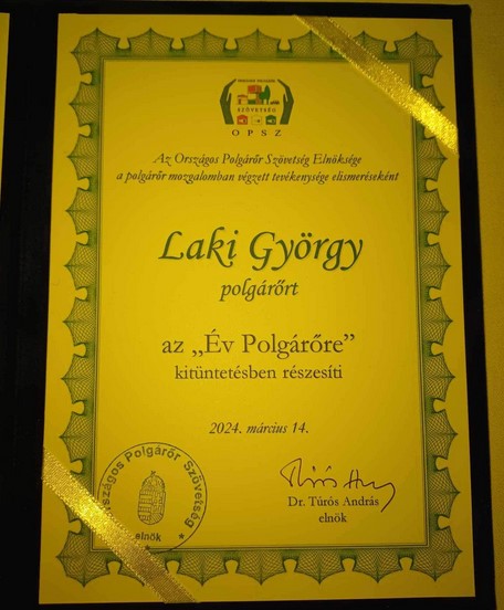 Az elnökség minden évben egy polgárőrt, és egy-egy egyesületet díjaz vármegyénként az elismeréssel. Laki György mellett a győri Arrabona Polgárőr Egyesület vehette át az elismerést a vármegyéből.