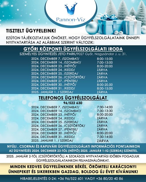 A Pannon-Víz tájékoztatja tisztelt ügyfeleit az ünnepi időszakra vonatkozó nyitvatartási rendjéről, amely az alábbiak szerint alakul: