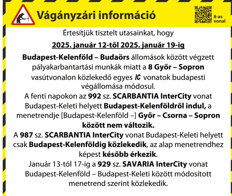 - 992 sz. SCARBANTIA InterCity: Az érintett időszakban a vonat a Budapest-Keleti pályaudvar helyett Budapest-Kelenföldről indul. A menetrend a Budapest-Kelenföld – Győr – Csorna – Sopron útvonalon nem változik.