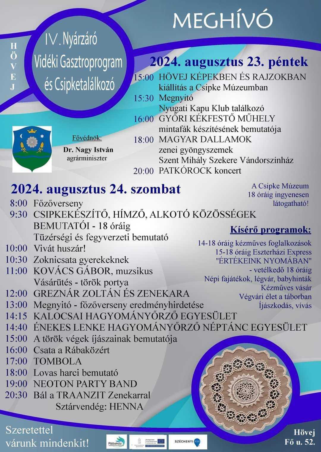 Szebbnél szebb kézimunkákkal, alkotásokkal telik meg a polgármesteri hivatal udvara szombaton. Érkezik a Nemzeti Művelődési Intézet Győr-Moson-Sopron Vármegyei Igazgatóságának munkatársai a vármegyei értékekkel és a Hungarikum Játéktérrel, a Montázs Kézműhely Egyesület tagjai kézműves termékekkel és foglalkozásokkal, valamint a Höveji Nyakleves csapatát erősítik a déli ebéd elkészítésénél a Karcagi Birkafőzők.