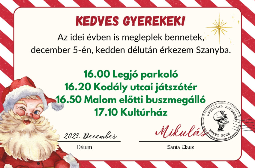 December 5-én, kedd délután érkezik a Mikulás Szanyba.