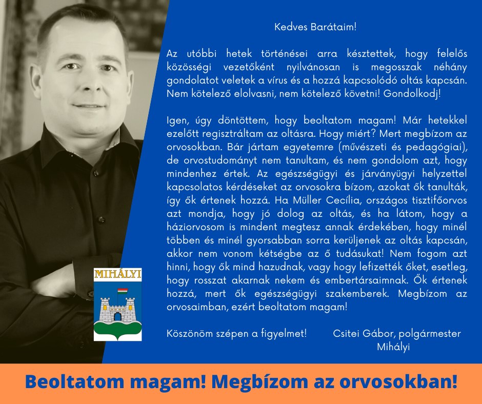 Az utóbbi hetek történései arra késztettek, hogy felelős közösségi vezetőként nyilvánosan is megosszak néhány gondolatot veletek a vírus és a hozzá kapcsolódó oltás kapcsán - írta közösségi oldalán Mihályi polgármestere.