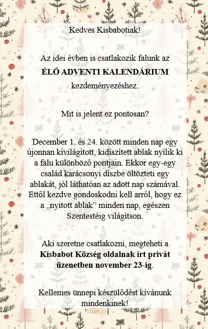 Kisbabot községe idén is csatlakozik az Élő Adventi Kalendárium kezdeményezéshez, hogy ünnepi hangulatot varázsoljon a település lakóinak mindennapjaiba.