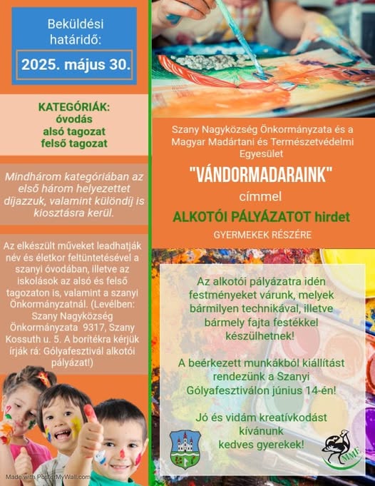 Szany Nagyközség Önkormányzata a Magyar Madártani és Természetvédelmi Egyesülettel közösen alkotói pályázatot hirdet óvodás, alsó és felső tagozatos gyermekek számára.