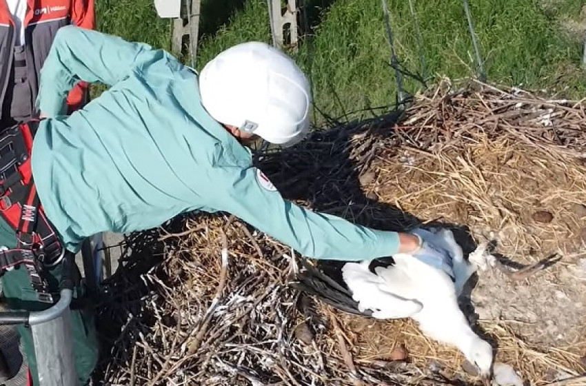 A Fertő-Hanság Nemzeti Park Igazgatóság kérte az E.ON segítségét a mentésben: kollégáink a lehető leghamarabb a helyszínre érkeztek. Kosaras autóval óvatosan megközelítették a fészket, a Nemzeti Park természetvédelmi őre magához húzta a fiókát és levágta a lábáról a rátekeredett bálamadzagot. Ezután szakszerűen összecsukta a madár szárnyait, nehogy a még ügyetlenül repülő fióka kiugorjon a fészekből. A bálamadzag minden részét eltávolította a fészekből, ahogy azt gyűrűzéskor is teszik, hogy a jövő generációit ne akadályozza mozgásukban. Ezt követően az E.ON-os szakemberek biztonságosan a földre szállították a gólyafiókát.