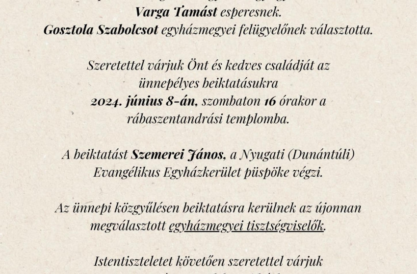 Ünnepélyes beiktatásra várják a híveket a rábaszentandrási evangélikus templomba holnap délután 4 órakor.
