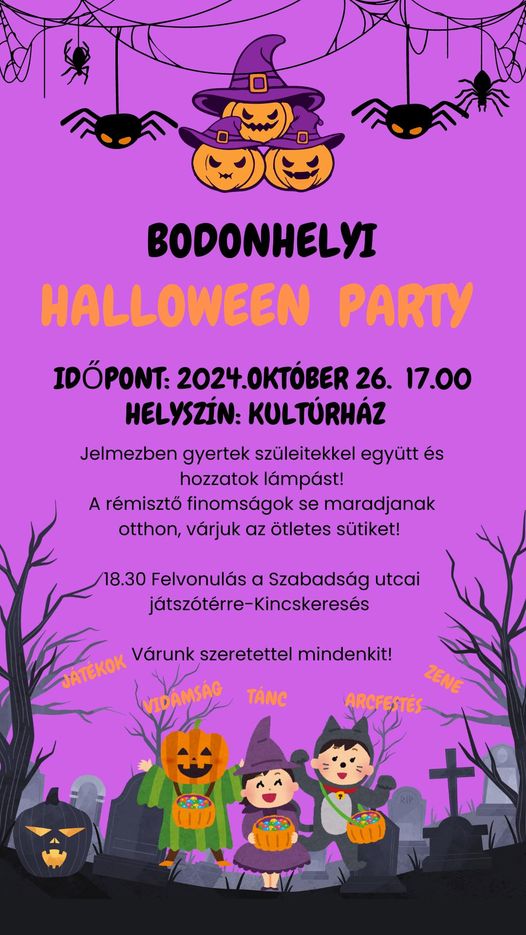 Bodonhely izgalmas Halloween Partyra invitálja a gyerekeket és szüleiket október 26-án, szombaton 17:00-kor a Kultúrházba.