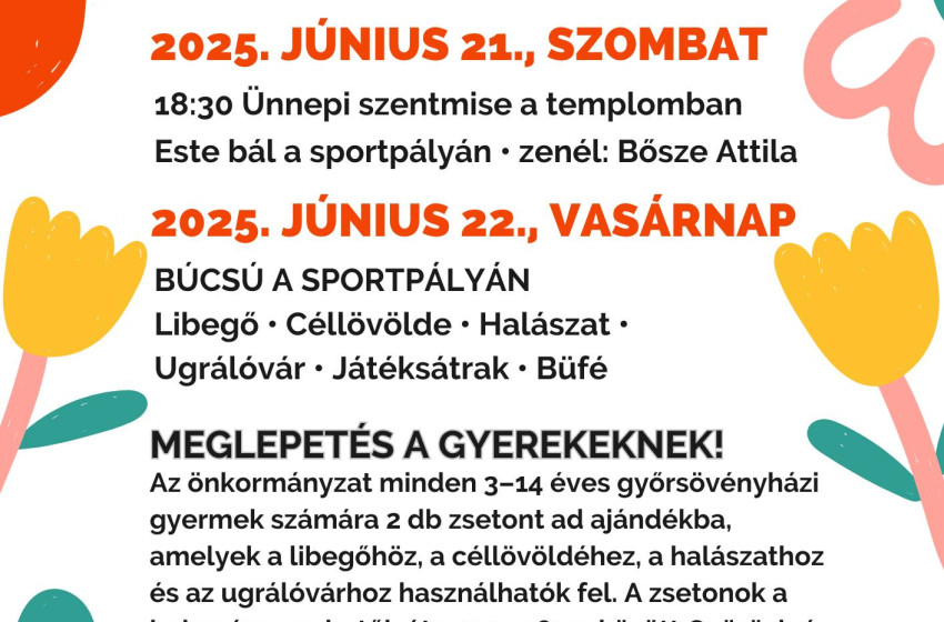 Vasárnap a sportpályán libegő, céllövölde, halászat, ugrálóvár, játéksátrak és büfé várja az érdeklődőket, míg az önkormányzat minden 3-14 éves győrösvényházi gyermek számára 2 db zsetont ad ajándékba. A zsetonok Szabó Tamaránál vehetők át 14-18 óra között.