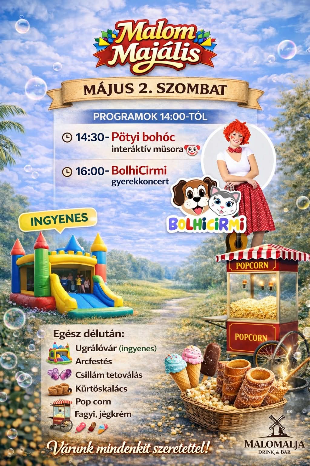 Vidám, családbarát programokkal várja az érdeklődőket május 2-án, szombaton a Malom Majális, amelyet a Malomalja Drink & Bar szervez Rábapatonán.