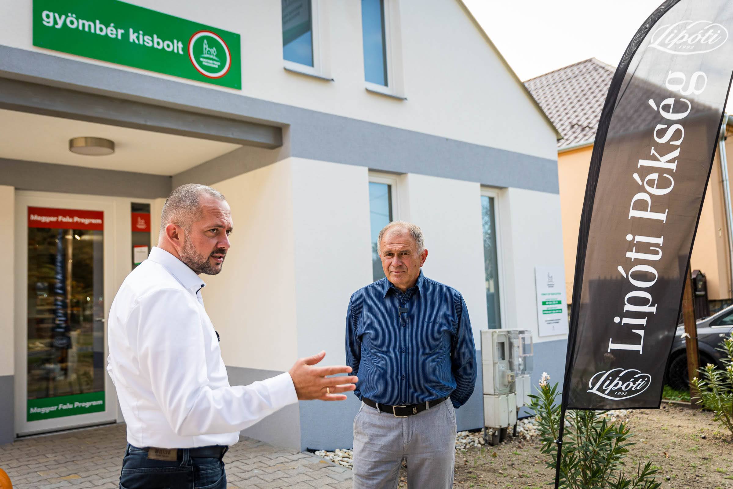 Gyopáros Alpár országgyűlési képviselőnek mutatja meg az új boltot Győrvári Balázs tulajdonos