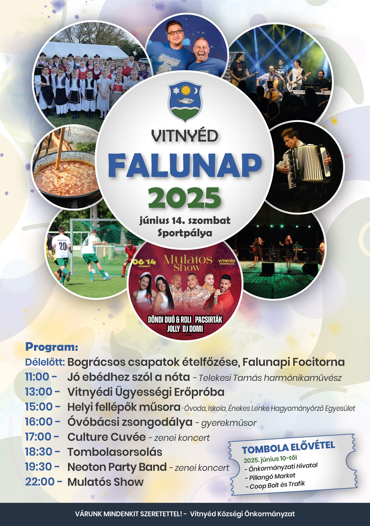 Vitnyéd község újra megtelik élettel és jókedvvel június 14-én, amikor a helyi sportpályán megrendezésre kerül a hagyományos Falunap. A rendezvény a közösség erejét ünnepli, gazdag programkínálattal várva a kicsiket és nagyokat egyaránt.