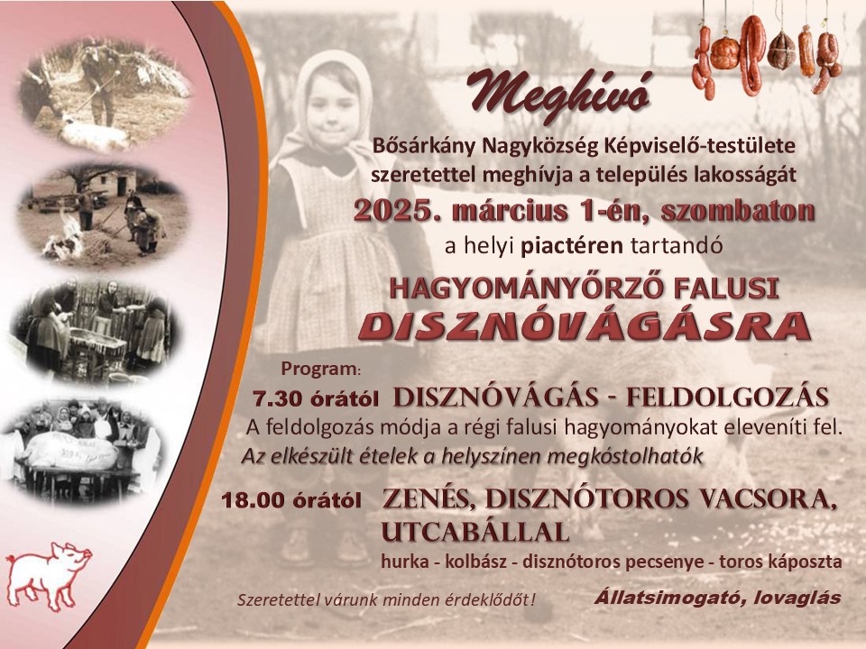 Bősárkány Nagyközség képviselő-testülete idén is megrendezi a település egyik legkedveltebb eseményét: a Hagyományőrző Falusi Disznóvágást.